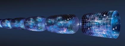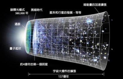 这张是NASA的示意图解释宇宙的进化,从大爆炸开始(左边)到今天(右边)。宇宙用一个钟的形状来显示它的扩张。大爆炸之后宇宙在很短的时间内快速的扩张,然后它的扩张开始变慢。