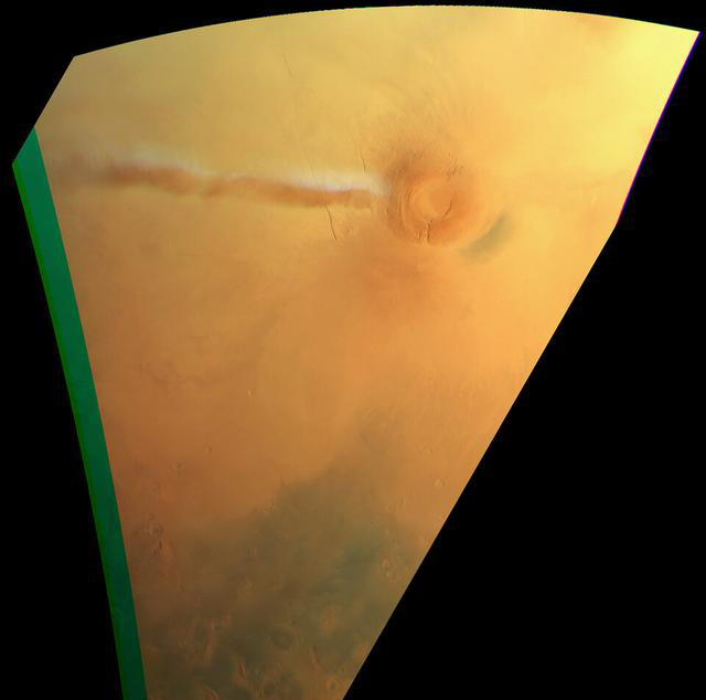 从照片上看到,火星阿尔西亚山(Arsia Mons)上空缭绕着一条很长的白色云带。阿尔西亚山是火星上的一个巨大的盾状火山,靠近赤道,高约二十公里。