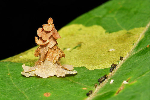 蓑蛾的幼虫会收集树木和叶子或其他物体,制作出睡袋并好挂在树上,而且这些睡袋的大小可能会达到5英寸 (~12.7厘米)。
