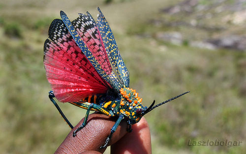 鲜艳的蚂蚱(Phymateus saxosus)。这种鲜艳的蚂蚱可以在马达加斯加找到,但他们非常危险,因为他们会吃有毒植物,并获取植物中的毒液,所以只要敌人吃下他们救会中毒而死。这种蚂蚱雄虫的大小可以达到4英寸 (~10厘米) 。