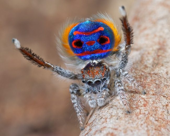 蜘蛛虽然不是昆虫,但这种孔雀蜘蛛非常特别,雄蛛身上鲜艳的颜色是为了求偶,孔雀蜘蛛是跳蛛科孔雀跳蛛属的其中一员,只生长于澳大利亚的新南威尔斯州及昆士兰州。造物主的奥妙就在这里!
