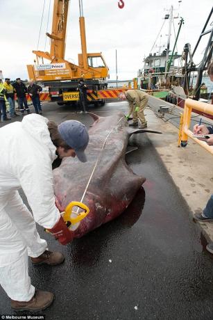当时,James Owen与他的船员抓到这只6.3公尺长的姥鲨,尽管这只鲨鱼拿去卖作鱼翅、鱼肉应该可以赚上不少钱,但他们还是做了正确的决定,把3000公斤重的鲨鱼捐献给科学研究。