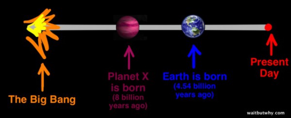 如果X行星有类似于地球的历史,让我们来看看今天他们的文明会是在哪(用橙色时间刻度作为参考,来说明绿色的时间刻度是如何巨大):
