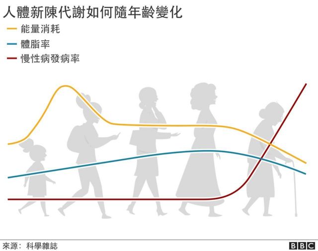 之后持续下降逐年递减,到90岁时新陈代谢比中年时低26%。