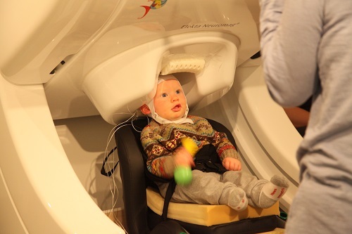 他们征招了16位11个月大的婴儿(当然是透过他们的父母亲才行)来做这项实验,其中半数的婴儿的家庭只说英文,另外半数是会说英文和西班牙文的双语家庭。这些婴儿在聆听一段他们平常会听到的英文、西班牙文或是此二语言都有的谈话,研究人员会用脑磁波仪(MEG)来观察这些婴儿的脑部活动。
