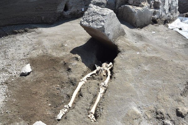 考古学家发现一名年约30岁的男性遗骸,照现场状况研判他应该是逃过了第一波火山喷发,并走在一层厚厚的火山砾上,但是身体却被一块重重的石头给压着。