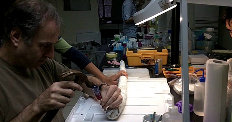 “第一次将管子从容器中取出来是非常壮观的。看到这个巨大的青铜黑色标本是惊人的。一方面来说,我很兴奋看到里面的样子,另一个方面,要解剖这个令人难以置信的稀有标本也有一点吓人的。”