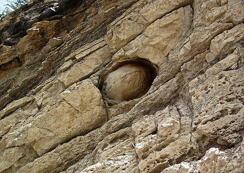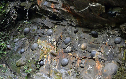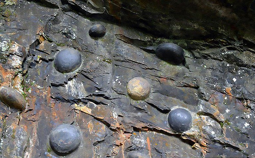 悬崖是由寒武纪时期大约5亿年前形成的一种常见的钙质石(calcareous rock)组成的。 另一方面,蛋是由更坚韧、更重的沉积物构成。 这意味着在长时间的降雨或突然的土石流期间,悬崖面往往会比蛋更快地消失。“蛋”的圆度很可能是被流水形成,但是还不清楚如何或为什么这么多陷入岩石中。