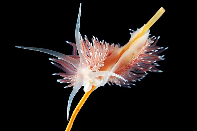 他的许多照片都来自于他探险期间收集并带到实验室的生物。这种名为Flabellina Polaris的海参非常的精美,后来他开始在自然环境中对它们进行拍摄。从照片中你可以看到它正在产卵。