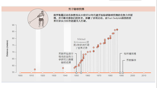 当时创下的一些世界纪录直到今天也没能被打破,比如苏联选手Yuri Sedykh于1986年在德国斯图加特欧洲锦标赛的男子链球比赛中创造的世界纪录。3年之后柏林墙倒塌,5年之后苏联解体。Berthelot认为,“在现在这个时代,打破纪录是件非常困难的事,因为运动员们不再使用那么多兴奋剂药物了。”