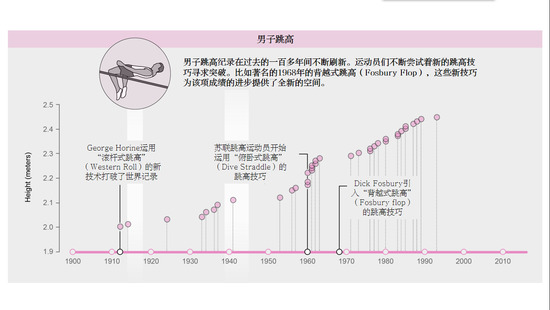 技巧上的突破也对体育成绩的提高起到了不小的作用——跳高的演化史就证明了这一点。在1968年墨西哥城举办的奥运会上,美国运动员Dick Fosbury以一种后来被命名为Fosbury式跳高(背越式跳高)的创新性技巧震惊了世界。在Fosbury式跳高中,他并未采用传统的面朝下的跳跃方式,相反,他以背朝下的姿态越过横杆。Fosbury赢得了当年的奥运金牌,尽管并没有打破当时的世界纪录。