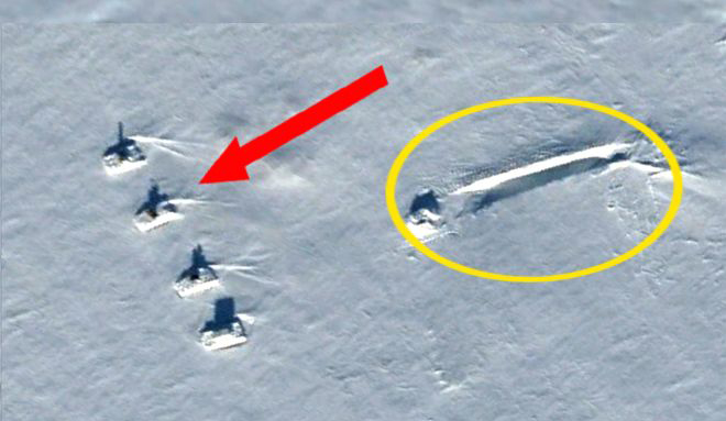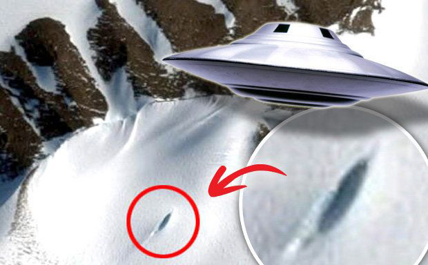 惊人消息指出,在图片中突出南极冰层的黑色物体,是高达1900英尺高的幽浮尖端。
