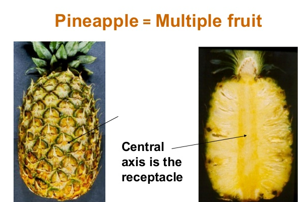 凤梨中间的轴心部分其实是花托,许多花朵会从上面长出来,再变成许多果实,最后才形成我们熟悉的凤梨!