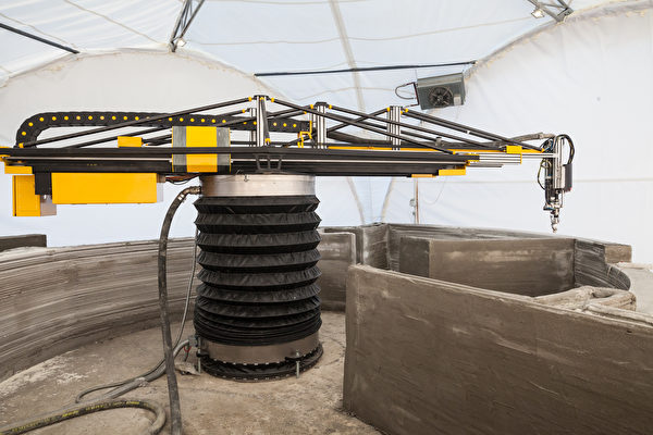 比利时Kamp C公司的3D打印机打造出一栋两层楼高的房屋。图为2016年12月9日,俄罗斯Apis Cor公司的3D打印机在盖房屋。(Shutterstock)