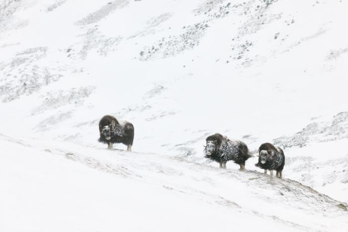 麝牛会在毛皮底层长出一层软毛以抵御严寒。 PHOTOGRAPH BY ORSOLYA HAARBERG, NATIONAL GEOGRAPHIC CREATIVE