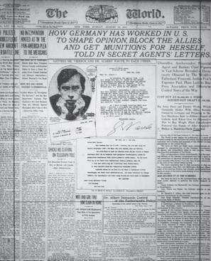 这个一石二鸟的计划,历史上称“Great Phenol Plot”(大石炭酸阴谋)。原本不露痕迹,却于顺利进行了几个月后,在美国媒体的追踪下曝了光。原来是海因利希·亚伯特不小心将公事包遗留在火车上,泄露了相关文件。只是他的行为并非违法之举,美国政府无法对其行为有约束能力,因此有人将该批文件透露给当时美国反德的报纸《纽约世界报》,才让这计划于1915年8月15日摊在大众的眼前。