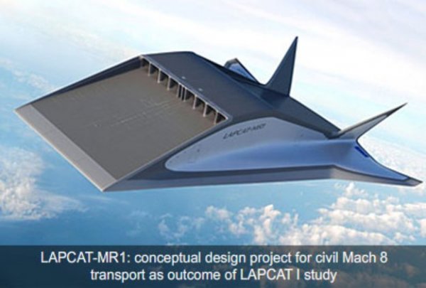 这些设计之一是Lapcat-II,一架由欧洲设计的巡航速度高达八倍音速(8500公里/小时或5280英里/小时)的飞机,能在2小时55分内把乘客从布鲁塞尔送到悉尼。