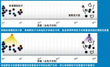 麻烦的事情还不止这些。物理学家还推测,宇宙中存在一个所谓的“普朗克质量”,约为质子质量的1千亿亿倍一一10的负5克,大约相当于一粒灰尘的质量,这是粒子质量的最大上限(如果再大,引力就会使得粒子变成一个黑洞)。而希格斯粒子与其他粒子的相互作用,就会使得所有粒子逐渐接近普朗克质量。
