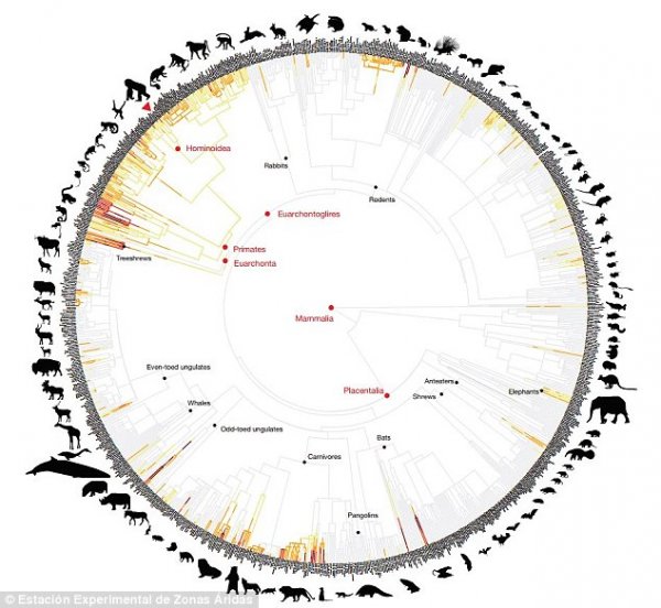 研究人员将哺乳动物放在同一个进化树中,以此来表示各不同哺乳动物的攻击性。随着颜色的增加表示攻击性依次增强,颜色由黄色到深红色,浅灰色则表示没有致命攻击性。