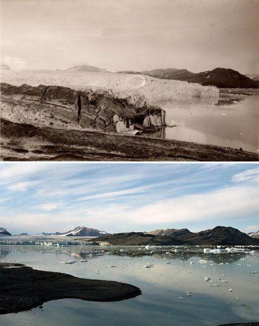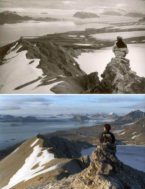 他将现在的大自然照片与20世纪初拍摄的照片进行了比较,让大家明显看到这100多年发生的惊人变化。上方的黑白照片是大约100年前北极的样子。