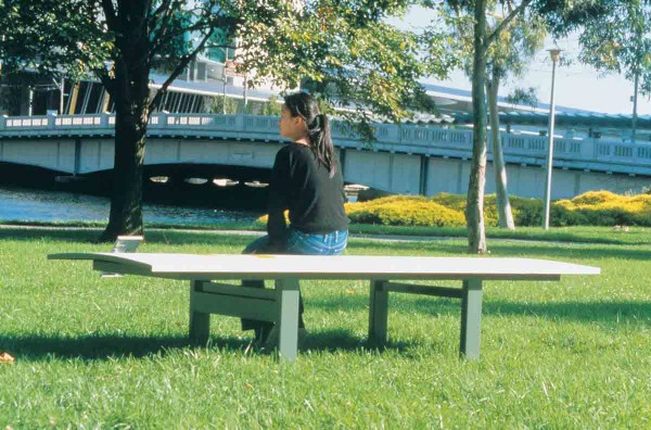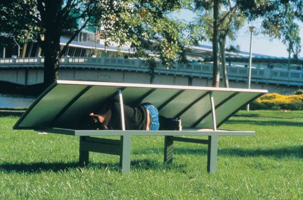 白天时它是一张长凳,在翻转出盖子状的遮蔽物时,它即成为游民的安身之所;这是个尚未被建造的设计提案。
