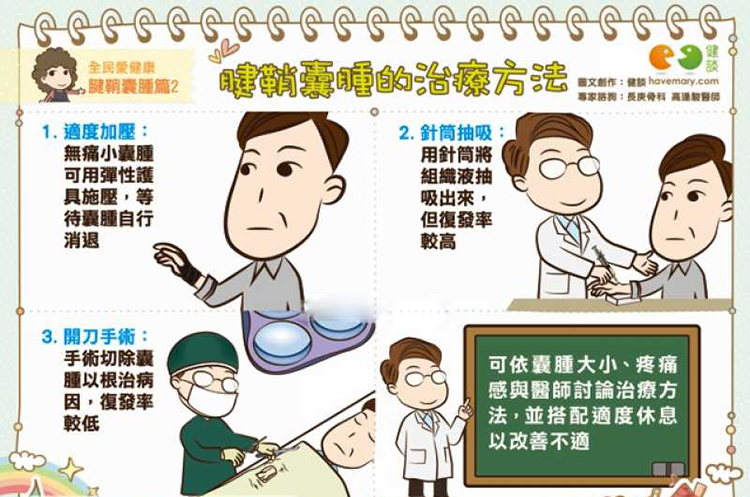 腱鞘囊肿严重时会造成弯曲手指或手腕关节运动困难,或是开始感觉到囊肿逐渐长大、变硬,甚至出现疼痛或异物感,这时就必须要就医治疗。腱鞘囊肿里其实是黏稠透明、类似于润滑的关节液,治疗方法可以选择用粗针把关节液抽吸出来,但是复发率较高,或是可采用戴护具的加压方式让囊肿自行消除,如果不断复发,可能就要考虑用手术切除的方式。