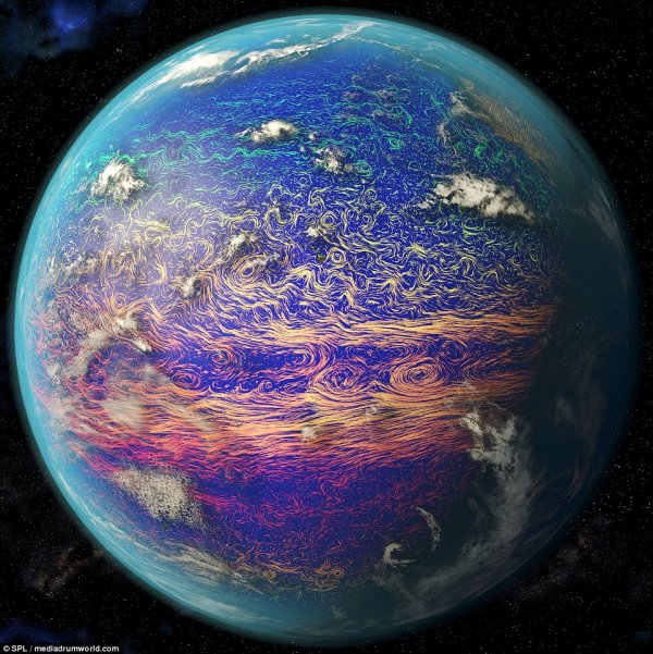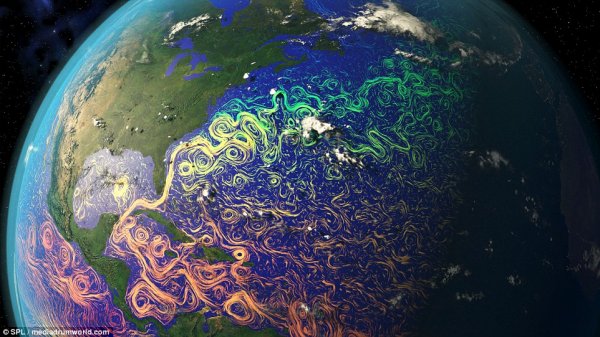 彩色漩涡显示的是各种温度的洋流,从两极凉爽的绿色到赤道附近温暖的红色。图像是根据美国宇航局各种环绕地球的卫星拍摄而分析出的分层洋流数据制作成。