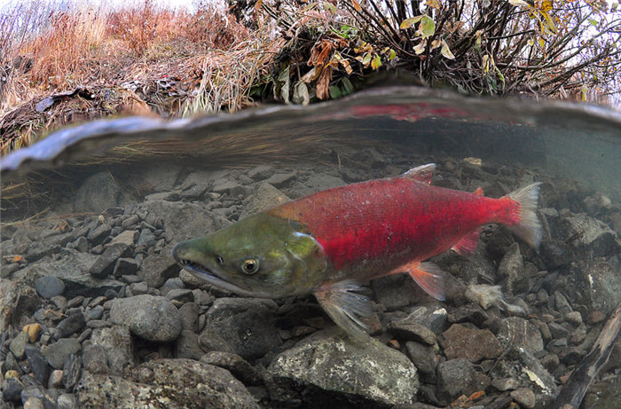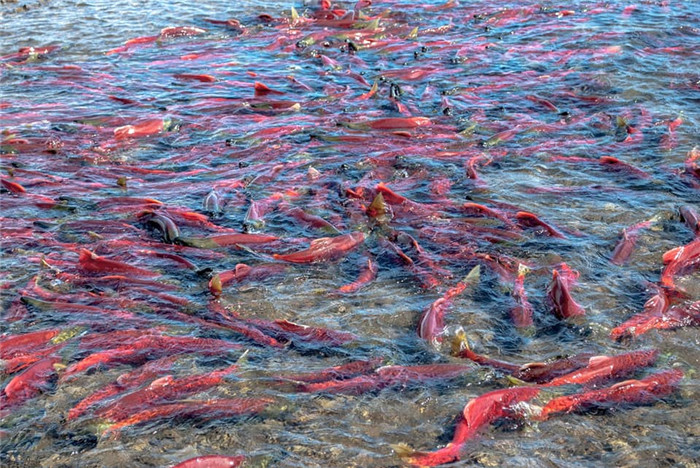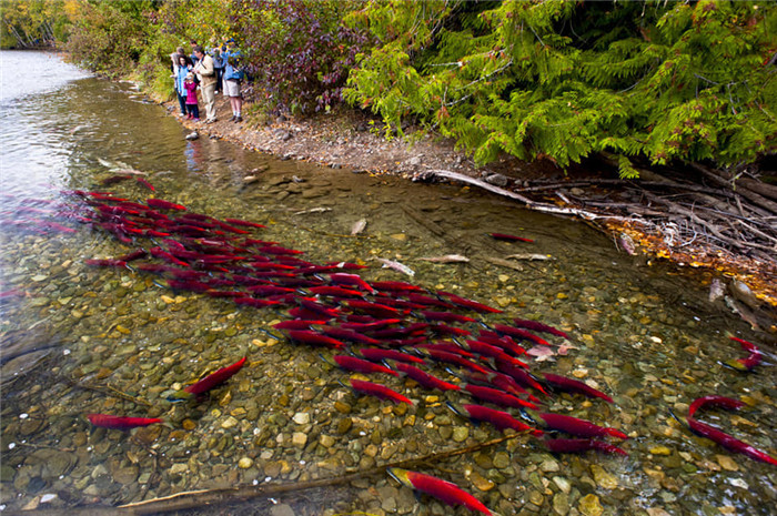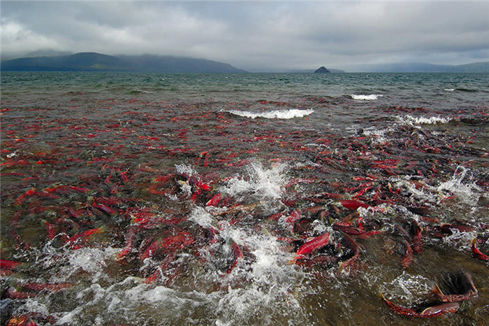 由于鲑鱼的数量太多,看起来水面就像变成了一大片红色,见证著鲑鱼世世代代的生命循环。