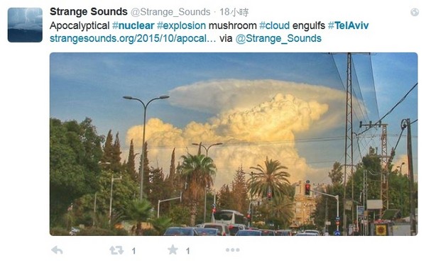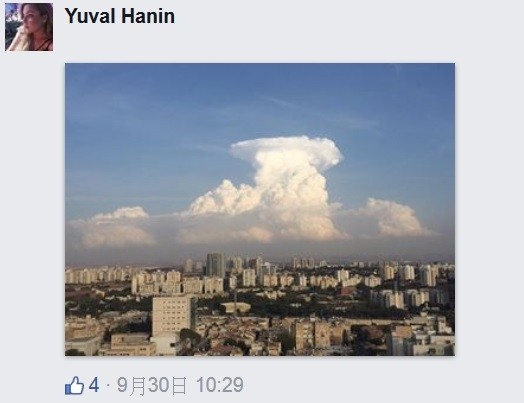 上个月底,以色列特拉维夫(Tel Aviv)的天空出现大片蘑菇云,犹如核弹爆炸。以色列网民Shlomi Mizrahi在脸书上po了这难得一见的景象,云朵就像颗巨大的蘑菇一般,短时间内,已有许多网友案赞,也有人接着分享自己拍到的照片。