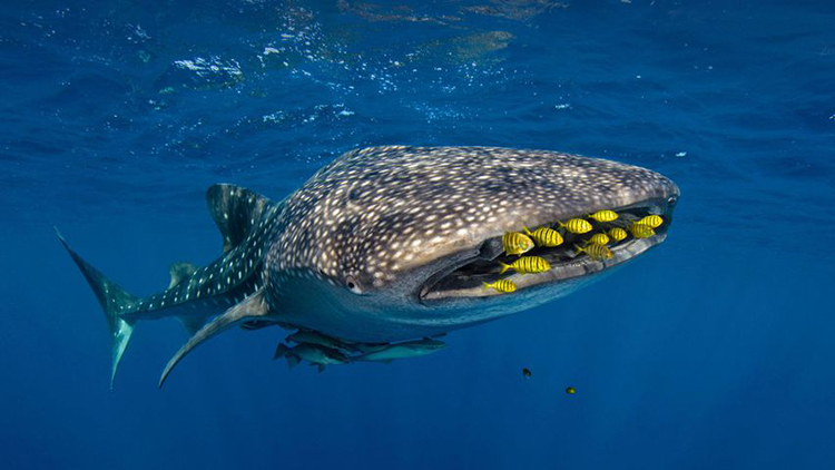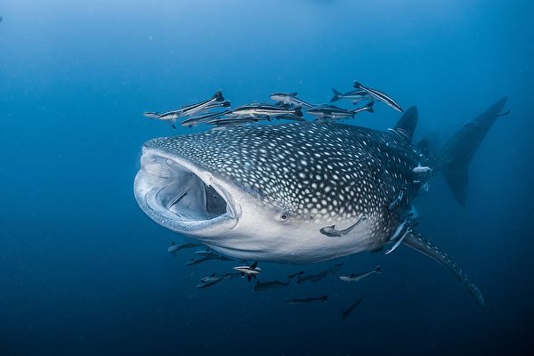 被称为“海洋温柔巨人”的鲸鲨是目前已知世界上体型最大的鱼类,体长可达18米。长期以来,研究人员观察到鲸鲨是滤食性动物,即张嘴吞下大量海水和其中食物后,再排出水留下食物,其典型食物是磷虾等小型浮游动物。