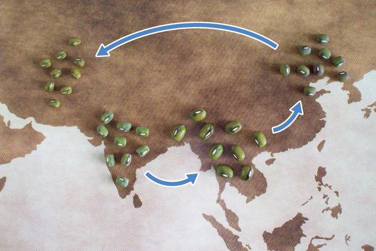 过去考古证据显示,绿豆在数千年前首先于南亚印度次国内被驯化。有趣的是,遗传分析发现它们并非向各个方向同时扩散,而是寻着南亚、东南亚、东亚,再到中亚的逆时针方向传播(图一)。