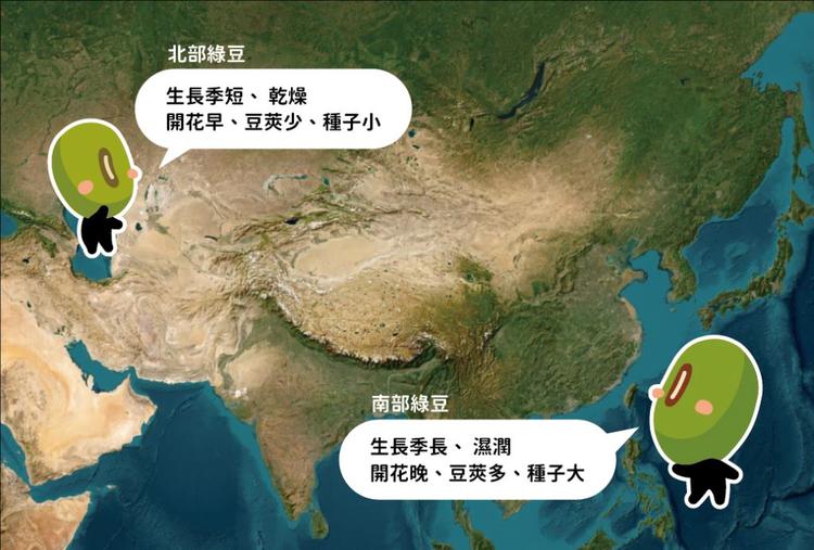 图二、亚洲南、北部的气候差异会影响绿豆的生长,导致绿豆的形态特质产生差异。图/科学月刊 底图/ArcGIS