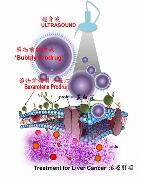 这说明Targretin以药物前体(prodrug)的形式注入微小的纳米尺寸的气泡,意味着该化合物维持不活跃状态直到被触发。用一种复杂的导管将这些气泡被注入活体猪的肝脏内,在细胞内化(internalization)过程中,超音波被用来爆破纳米气泡,活化药物前体并释放到癌细胞内。