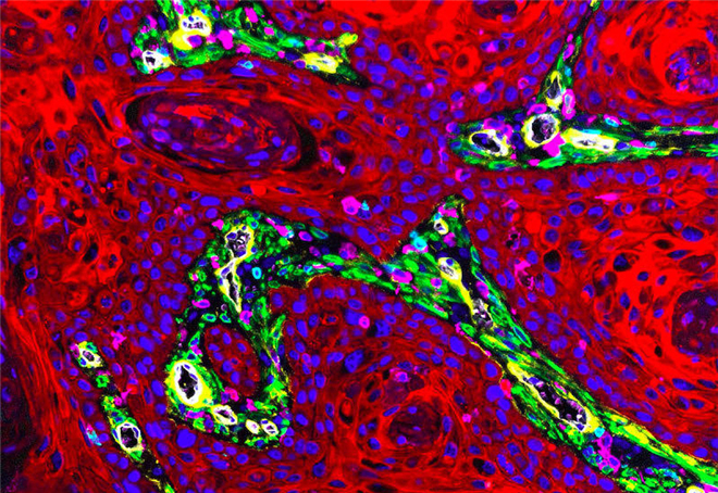 绿色的是纤维母细胞,这种细胞已经被证实能够刺激癌细胞的生长。白色和黄色的色斑表明血管从肿瘤中穿过。