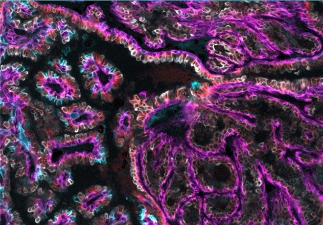 这是乳腺组织细胞,MultiOmyx系统被用于展现乳腺癌的前体细胞。粉红色和淡蓝色标识的两种蛋白通常无法在健康乳腺组织中发现。