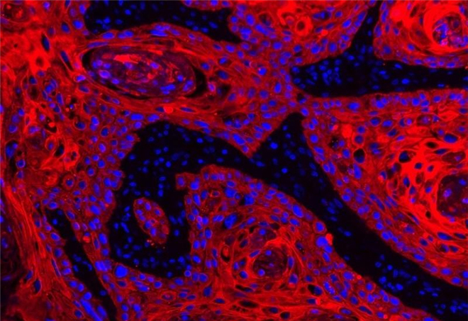 借助GE的新技术,你能够更清楚的观察癌变细胞。恶性肿瘤细胞呈现红色,细胞核呈现蓝色。