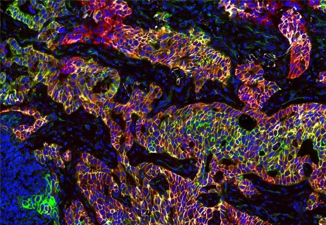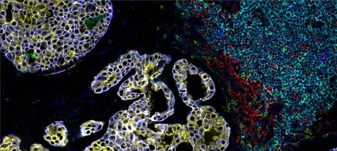 左侧的紫色和金色区域是两种以上与乳腺癌相关的蛋白质。但是在右侧也存在一些相当强大的免疫细胞。这些免疫细胞呈现出红色、绿色和蓝色。大量的免疫细胞可能意味着身体正试图对抗这些新肿瘤。
