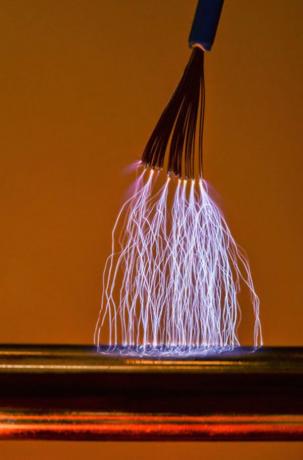 不管这样的事情以前是否有人做过,至少现在是有了。摄影师Marc Simon Frei做了一些便携式的特斯拉线圈,并拍摄下了些许美妙绝伦的照片。Frei的材料来源于上个世界二十年的一个电疗设备(本质上就是一个迷你特斯拉线圈),这是他在Ebay上买到的。Frei成功地让它产生了放电现象,并用Nikon Df捕捉下了这些放电现象。毫无疑问,当Frei开启这些放电设备时,自己已处于危险之中,但他冒的风险也得到了一定的回报。