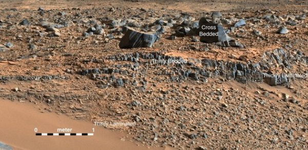 研究人员检验了好奇号传输回来的图像,分析了从盖尔陨坑收集的土壤样本数据。他们注意到了三种不同的岩石沉积,这为流水的存在提供了证据。第一种是碎石,它通常存在于河床底部;第二种是砂岩;第三种则是粉砂质的岩石,这可能曾是静水底部沉积而成的淤泥。