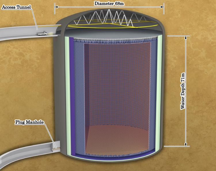 中国呢,则预计在广东的江门市,用 2 万支 51 厘米光电倍增管和 2 万 5000 支 7.6 厘米光电倍增管,在地底 700 米深处,打造巨大球形的微中子探测器-江门中微子实验室,内部可以填充两万吨的纯水。最新的消息是预计 2024 年就能启用。