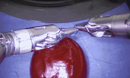 优雅而又稳定的穿针引线,成熟稳健的缝合了新鲜葡萄上开裂的葡萄皮,这不是什么手术室新来的实习医生,而是一台名为达芬奇手术系统的高端远程遥控机器人,下面的一堆动图里,你能看到它对缝合做最后的润色,打结,剪掉多余线头,轻松完成任务。