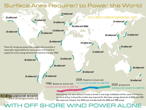 如果我们只使用非常高效率的涡轮机(也就是40%的容量产生4百万瓦功率的涡轮机),大约149万台涡轮机就可以供应全世界的电力消耗。