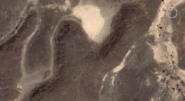 该照片位于中东地区,结构的中心看起来像一只眼睛,外面围绕三个三角形,而一小堆石头从三角形指向靶心。西澳大利亚大学研究人员认为,这可能是古老的墓地。