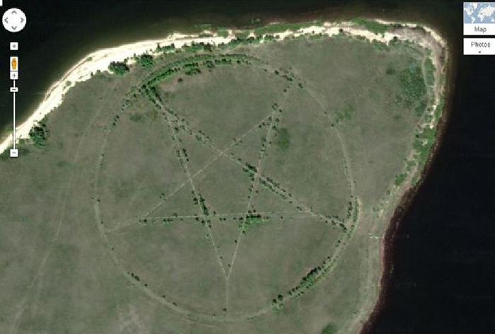 在哈萨克斯坦的一个孤立的角落里,有一个巨大的五角星,直径约1200英尺(366米)。有科学家尝试去探索其中的奥秘,最终发现原来五角星只是一个星型公园的轮廓。五角星的线条是马路,而道路两旁都是树木,使得在航拍照片中这颗五角星的形状更加明显。