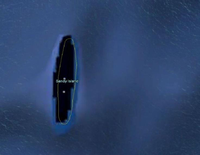 这是澳大利亚研究人员在南太平洋上发现的一个岛屿,大小与曼哈顿岛差不多。岛屿在谷歌地球上显示为黑色多边形。但是当科学家后来再航行到那里时,他们发现那里是开阔的水域而并没有什么岛屿。