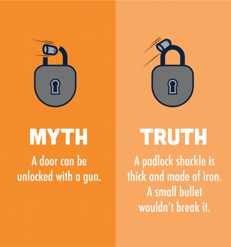现实:铁制的锁头会让子弹擦过,无法被射穿。
