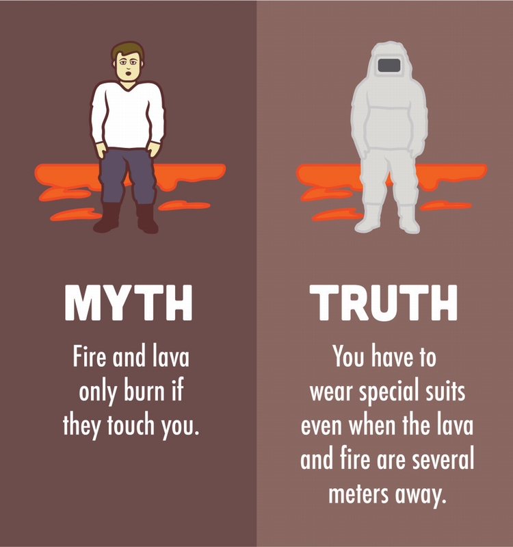 现实:由于温度太高,就算岩浆离你很远你还是得穿防护衣。