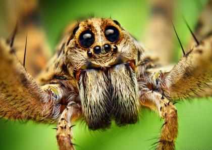 跳蛛是一种分布较广的蜘蛛,它们有8只眼睛,分3列,第1列位于头的前部,有4只眼睛,中间两只较大的眼睛为主眼;第2列位于头部靠后的位置,有2只眼睛,第3列在尾部上方,有2只眼睛;这3列眼睛使跳蛛具备了近乎360度的视野,而跳蛛极佳的视力则是主眼创造的,主眼中有较大的固定晶体和微小的回旋棒状的视网膜,能够在彩色和紫外线下呈现出高分辨率的图像。它们被认为是无脊椎动物中视力最好的。
